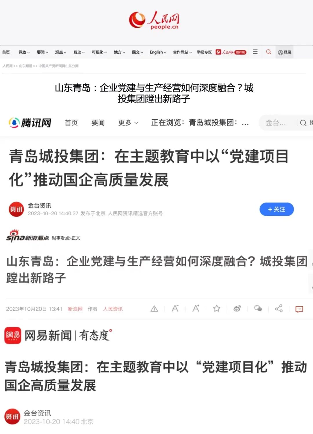 10月20日,人民日報旗下人民網在中國共產黨新聞網、人民網港澳臺版、金臺資訊、騰訊網、網易新聞、新浪網等知名媒體平臺集中報道了《在主題教育中以“黨建項目化”推動國企高質量發展》《企業黨建與生產經營如何深度融合?城投集團蹚出新路子》兩篇文章16次。青島城投集團“黨建項目化”的創新做法,為國有企業破解黨建經營“兩張皮”難題給出“城投答案”,在互聯網引發熱烈反響。